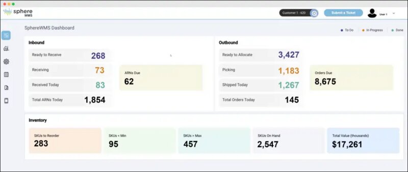 The order fulfillment tool integrates customers’ business rules into the system to optimise allocation and picking (including FIFO and attribute-based allocation). The SphereWMS dashboard and reporting features provide real-time operational metrics and inventory visibility for warehouse staff and managers.